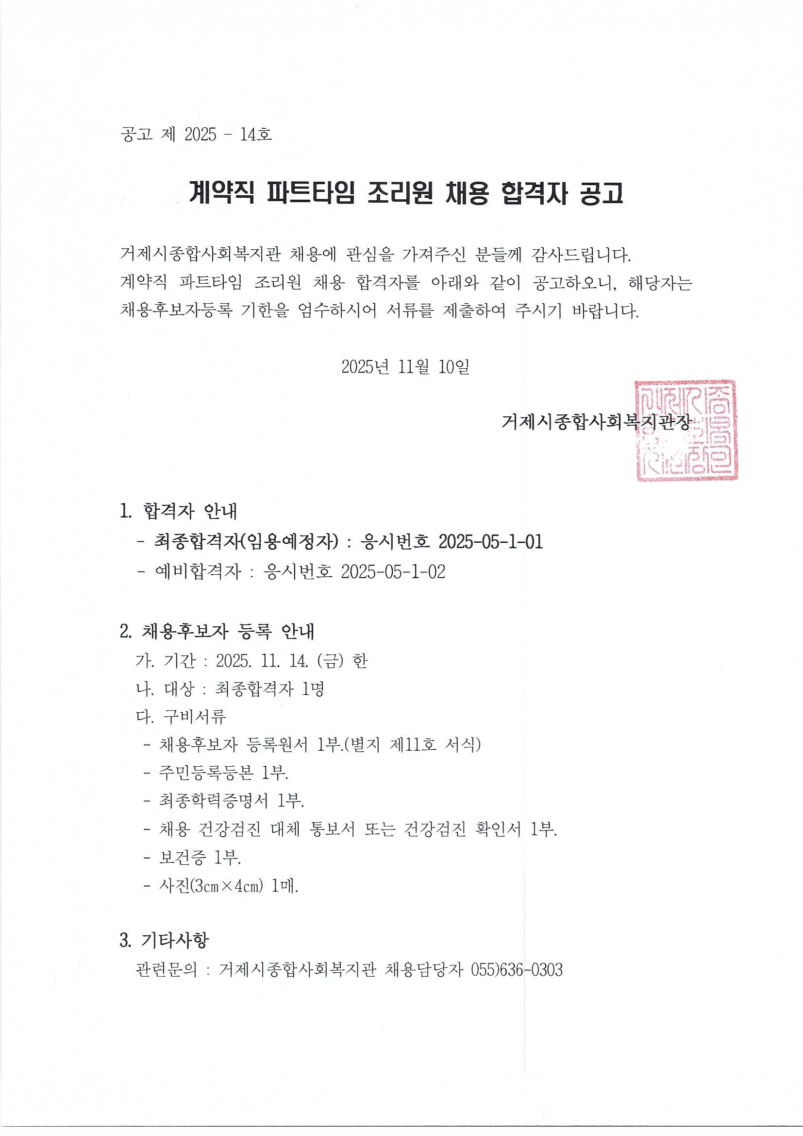 계약직 파트타임 조리원 채용 합격자 공고