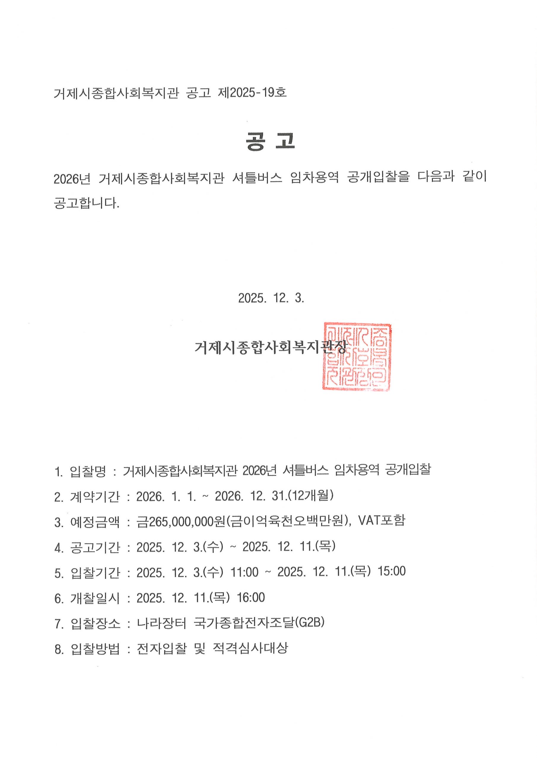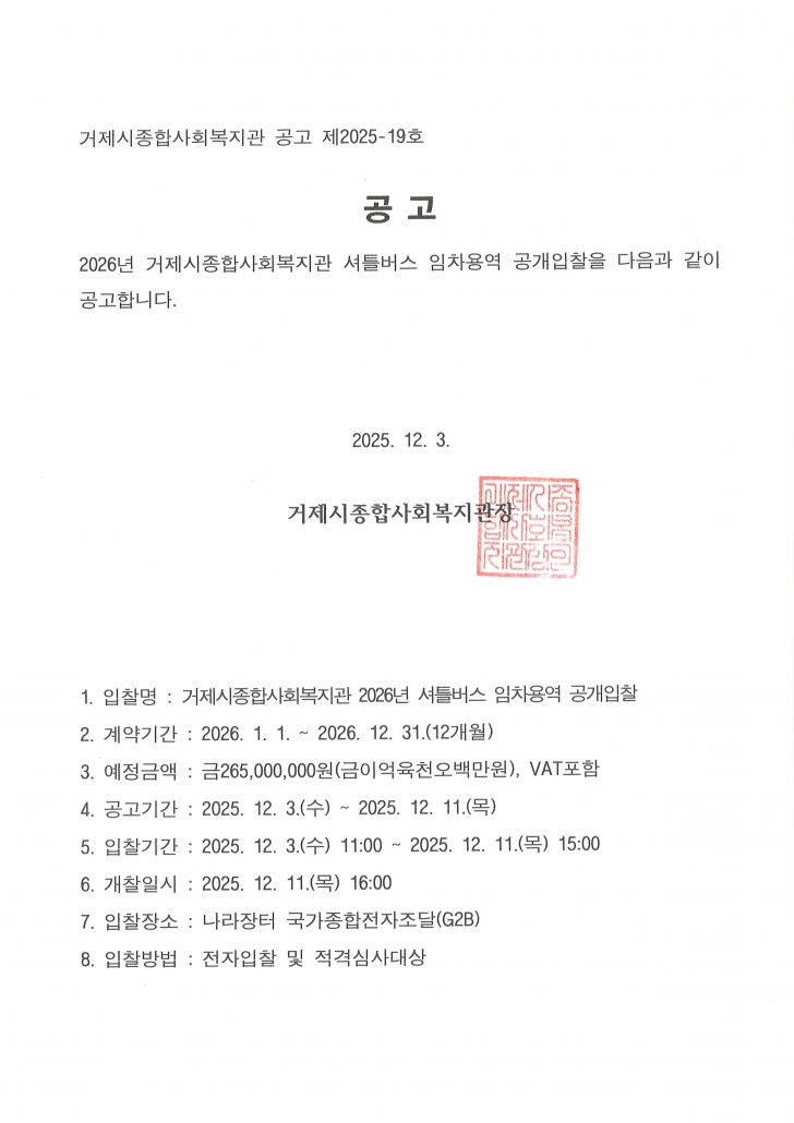 2026년 거제시종합사회복지관 셔틀버스 임차용역 공고