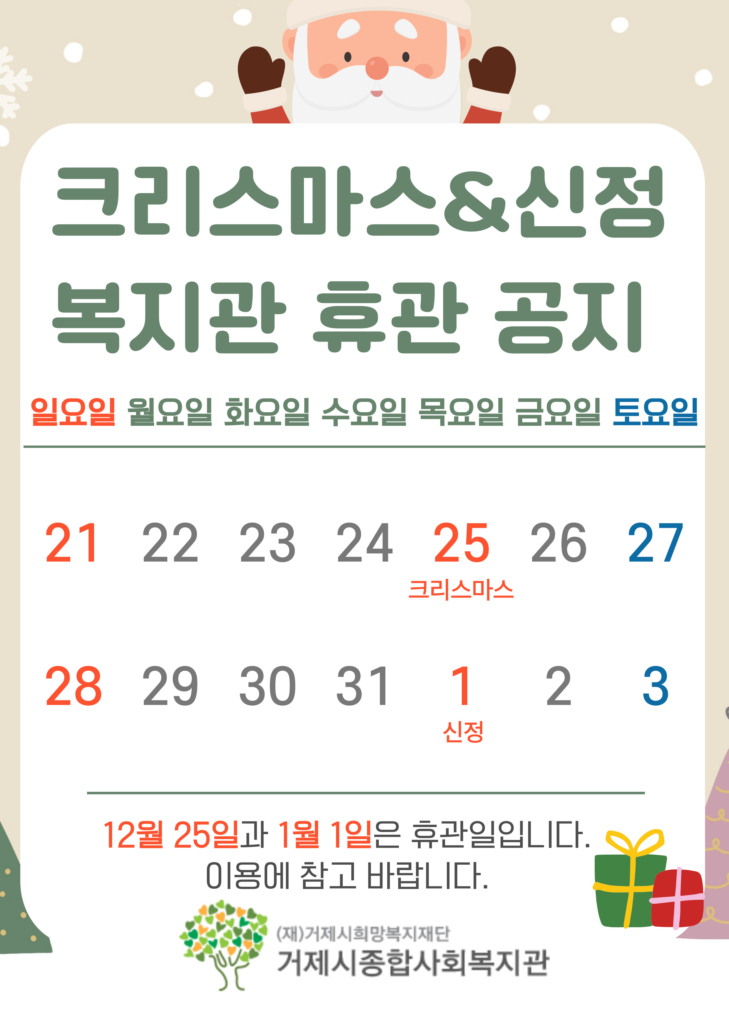 크리스마스(12월 25일), 신정(1월 1일) 휴관 안내