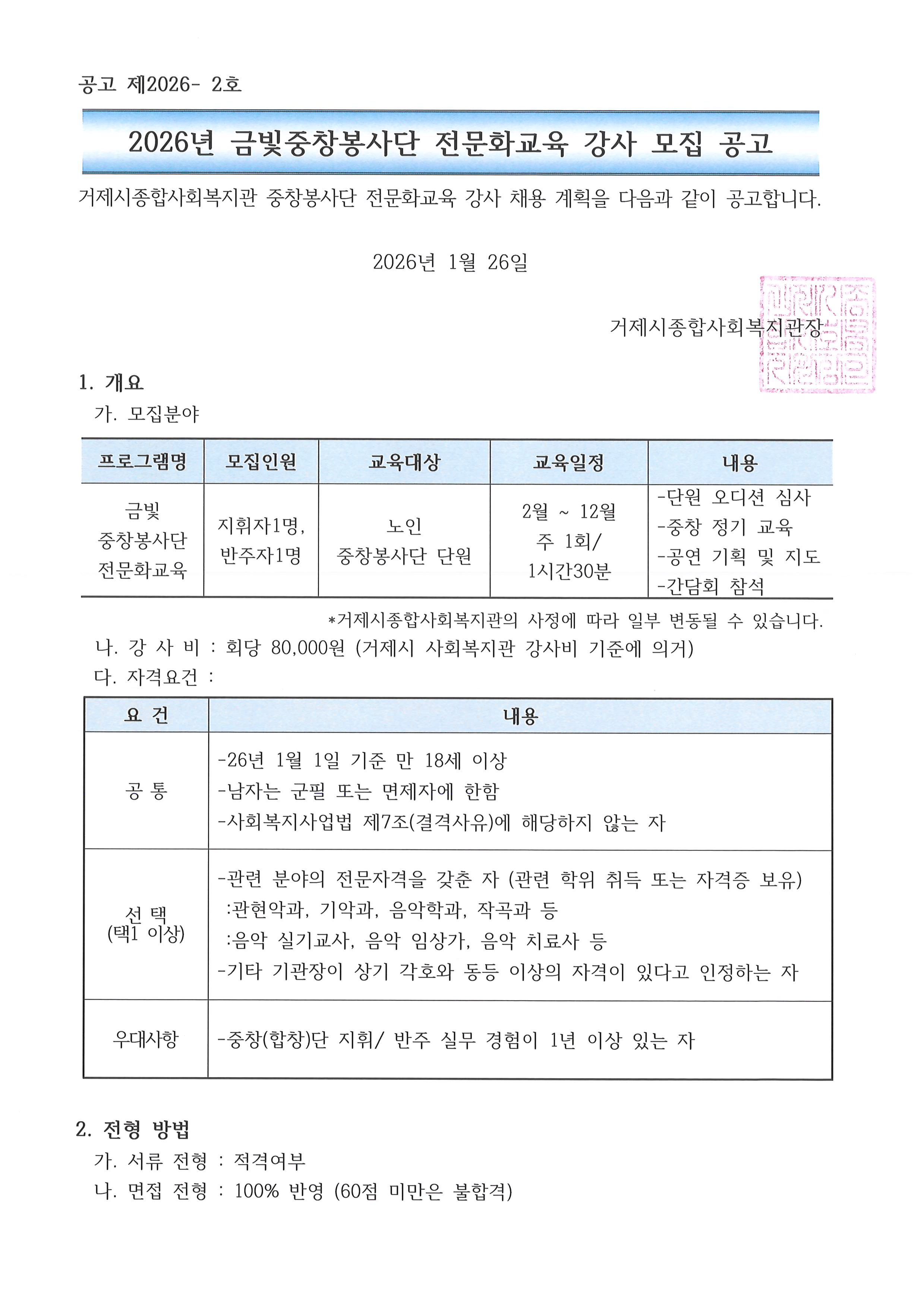 2026년 금빛중창봉사단 강사(지휘자 1명/ 반주자 1명)를 모집합니다