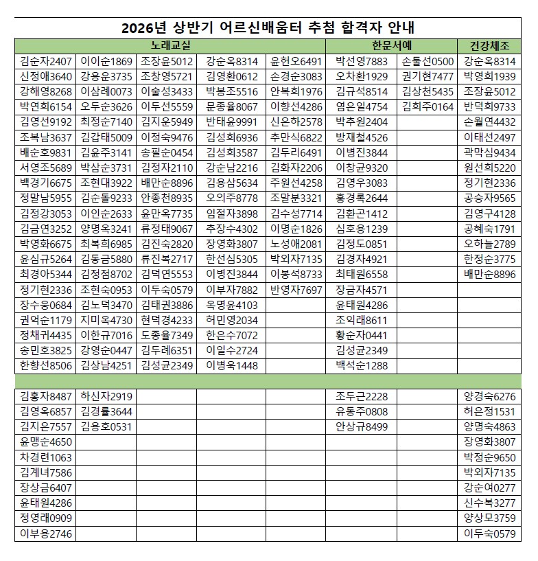 2026년 상반기 어르신배움터 추첨 결과 안내드립니다.