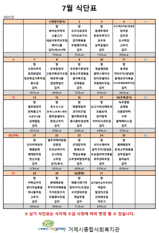 25년 7월 식단표